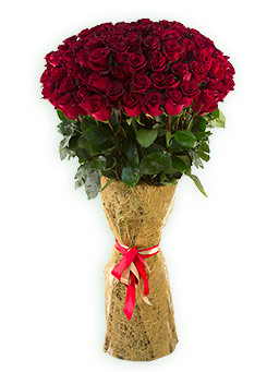 Букет «51 роза » - состоит из розы «Гран-При» королевы роз, букет дополнен лаконичной упаковкой, с использованием натурального материала и шикарным атласным бантом