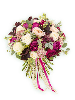 Очаровательный букет из крупной и кустовой розы, с веточками ароматного эвкалипта. Плотная сборка букета. Перевязан лентами и кружевом. Высота 50 – 60 см Стоимость - 900.000 т.р. (90 руб.)