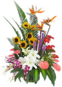 Композиция «Ассорти экзотик». Выполняется по предварительному заказу! Состоит из подсолнухов, стрелиции, лиатриса, антуриума, орхидей, лилии и гербер с зеленью.Удивит любого клиента размером и содержанием..